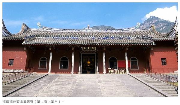 圖為湧泉寺於明朝時代的配置。天王殿丶大雄殿和法堂建於中軸線,廚房丶藏經殿和禪堂等建於左右兩側。其時尚未具備禪宗七堂伽藍的配置規模(資料來源:鼓山誌)。