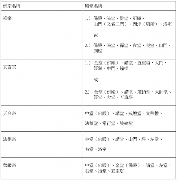 考古學者坂誥秀一指出,根據《安齋隨筆》〈後編十四 〉及《本阿彌行狀記》二書,佛教各宗的七堂制度如下:
