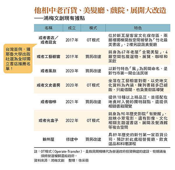 方向對了,就不怕路長。七年來,鴻梅文創陸續在新竹市舊城區增設同名品牌的「工藝櫥窗」、民宿、咖啡店、文史書房,以及戲院、書店和餐酒館等複合空間,每個據點都要有書,是他的堅持,且事前已考量到路線規畫,因此新竹市各據點相臨不過五分鐘路程,為的就是讓旅客可以待上一天、甚至住上一晚,深入體驗新竹風情。