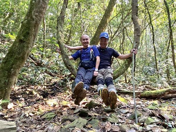 2名深山特遣男隊員同坐在血藤上盪鞦韆,爬山熱意瞬間全消。(深山特遣隊提供)