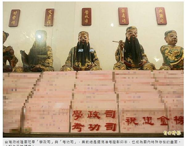 府城隍廟主委郭榮哲表示,府城隍爺威靈公領二十四司爺,各司其職,其中「考功司」考核官吏人事成績,「學政司」則是管理教育與考運。每逢考季熱潮,「學政司」與「考功司」案前總是擺滿准考證影印本,也成為廟內特殊存在的畫面。