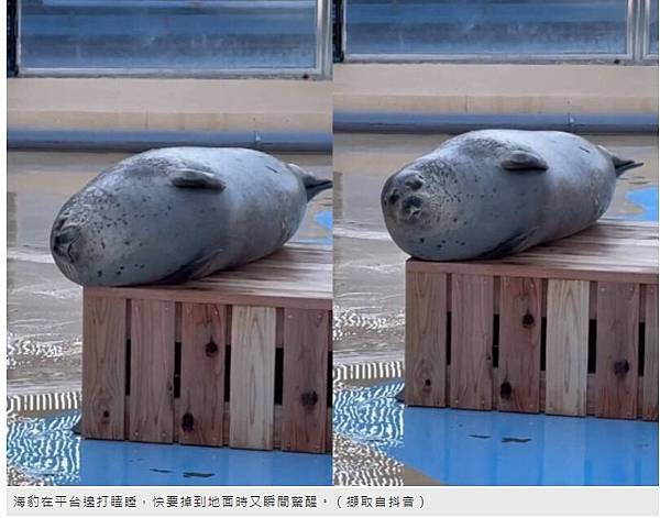 海豹在平台邊打瞌睡,快要掉到地面時又瞬間驚醒。(擷取自抖音)