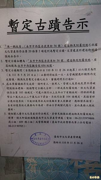 陳一鶴老宅「暫定古蹟」身份,依文化資產保存法,若遭任意破壞,可處6個月以上5年以下有期徒刑,得併科50萬元以上2千萬元以下罰金。(記者洪瑞琴攝)