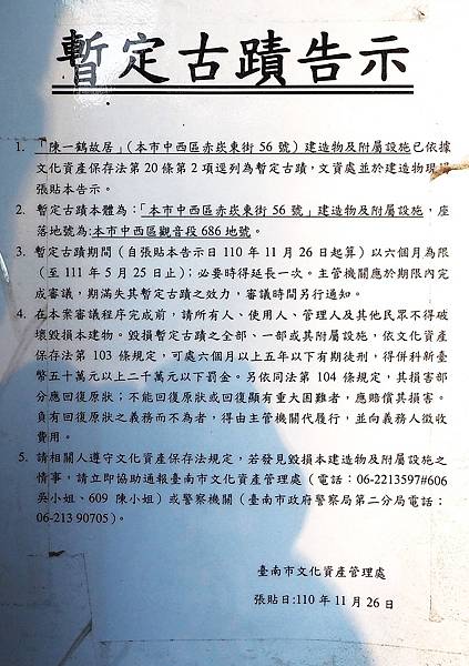 民視記者鄭博暉說,「這棟位在台南赤崁商圈裡面的,陳家古宅已經有80年的歷史,最近傳出屋主有意出售,也因此文資處趕緊貼出了,暫定古蹟的告示,將要來進行古蹟的審查。」