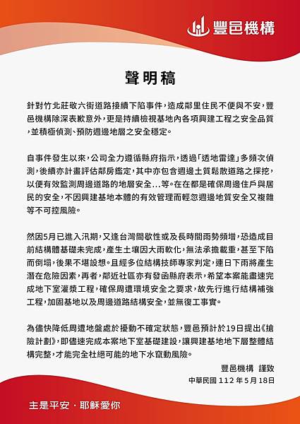 敬邀連署推動新竹縣政府主動調查竹北豐采520建案工地外圍連續坍塌事件後之地質現況與制訂相關施工爭議緊急處置辦法,善盡保護人民生命與財產安全之責。