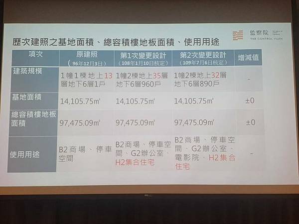 監察委員施錦芳、紀惠容今開記者會,批評建商是知法玩法,政府也有違信賴保護原則。施錦芳說明,最早接到周邊居民陳情,一調查發現這恐怕不只是如地檢署發現的偷工減料問題,關鍵在於該建案最早是抵價地,縣府標售時就明定只能商業用途,建照從民國96年地上13層、地下6層的商場,到108年變更為地上35層、地下6層的960戶集合住宅,最後於109年,為規避環評因素,再變更為地上32層、地下6層的890戶集合住宅。