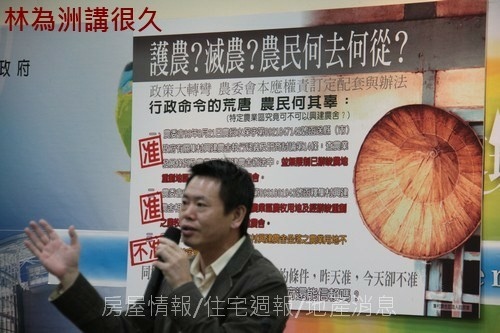 靳邦忠說,新竹縣農地種田不如「種房子」的現象,關鍵在農發條例修正後,開放農地自由買賣,任何人只要有○.二五公頃農地,就視為農民,九十年公布「集村興建農舍獎勵及協助辦法」,更讓非農民和建商得以興建實為別墅的集村農舍。