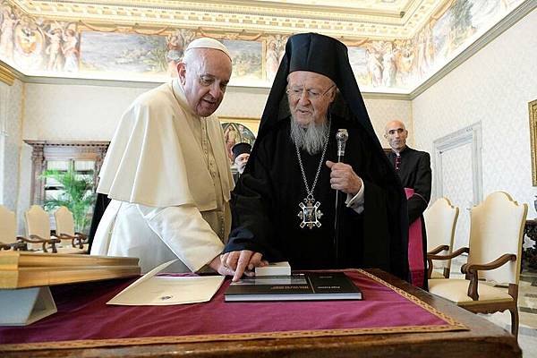教宗方濟各(左)近年多次與東正教普世牧首巴爾多祿茂(右)接觸,試圖緩和天主教與東正教關係。(路透資料照)