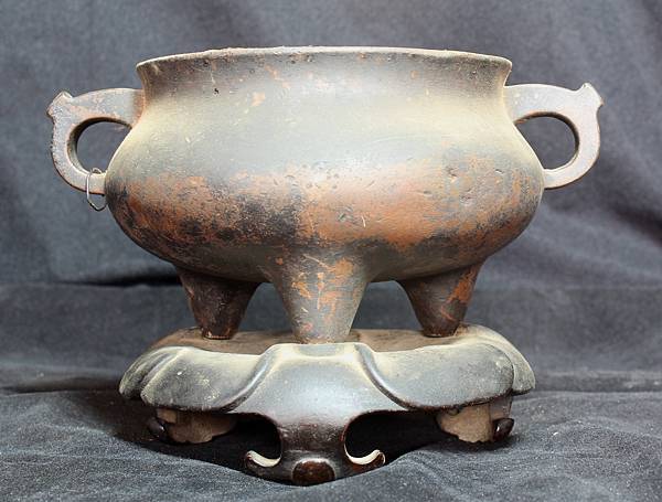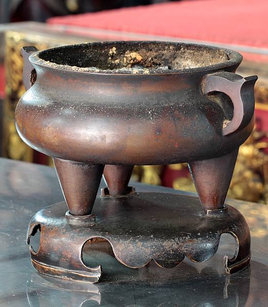 嘉義大林調查到的壓經爐,器表局部因氧化煙燻泛黑褐色,露出銅胎可見紅銅色,立於一荷葉形三足銅質底座上。該器系以失蠟法鑄造。爐底有四字「宣德年製」篆體款,在臺灣田調材料中比較罕見。考慮廟內7個牌位,皆作清代稱呼, 再加上此爐外表有長時間使用的凹陷銹蝕痕跡,綜合考慮其器形,不排除是清代所置。郭雙富先生收藏的壓經耳爐,則與此件型態、器耳、款式,如出一轍,只是爐身更寬更扁。