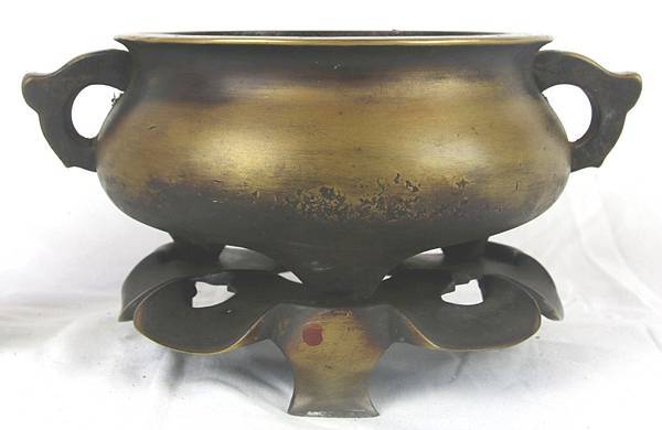 這件銅爐通高10釐米,爐口直徑10.5釐米,爐身泛金地兒,兩隻爐耳對置在爐身兩側。底款為楷書“大明宣德年制”。銅爐底座為褐色的荷葉座。