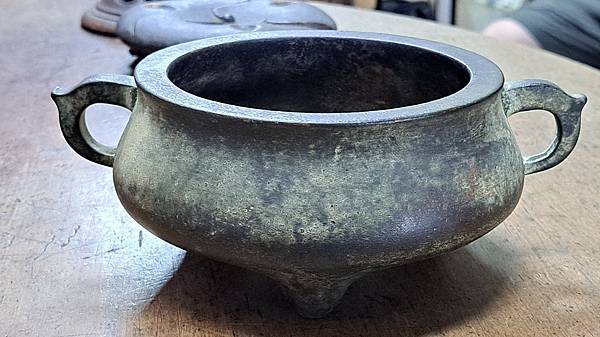 而三足壓經爐在數量上較圈足者少,大多以失蠟法鑄造,器型比例優美,爐耳不像圈足誇張而喧賓奪主。筆者所採集實物,從北到南,甚至離島寺廟皆見(以下為避免香爐遺失,隱去寺廟名稱)。另前些日子拜訪中部知名收藏家郭雙富先生,也收藏有壓經耳爐,反映各地收藏家可能有不少這類宣爐。