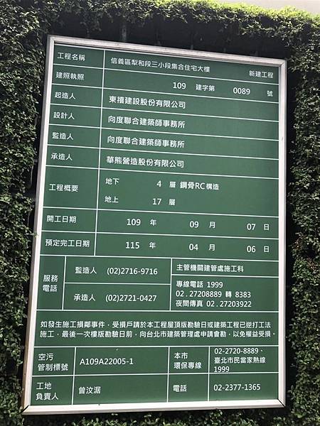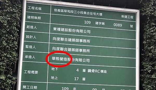 根據工地公告,建案承造人為「華熊營造股份有限公司」,華熊營造是日本知名營造公司「熊谷組」1974年在台灣創設,企業理念是秉持「遵守法令」、「工程安全零災害」、「工程品質無瑕疵」,所蓋的建築遍及全台,包括台北國際金融中心(101大樓)、中華「陶朱隱園」、新光摩天大樓、世界貿易中心(國際會議中心)都是華熊營造的作品。