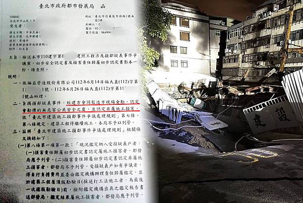 〔記者楊心慧/台北報導〕台北市中山區大直街94巷周邊7日晚間傳出民宅傾斜,疑似建案施工釀災,導致鄰屋整棟垮掉造成「二樓變一樓」的局面,台北市議員陳怡君於(8日)凌晨出示公文痛批,市府都發局在今年7月6日函覆陳情住戶的公文中,白紙黑字判定「會勘標的無危害公共安全之虞」、「建築工程得繼續施工」、「本局不予列管」。