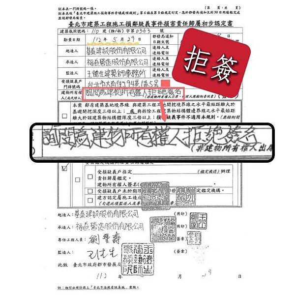 許淑華表示,建管處資料明確記載,施工後發生明顯的損鄰狀況,牆壁龜裂、門框變形導致大門無法正常關閉,結果建商及監造人做出「這些損害不是施工所造成」的結論,還要住戶替建商說法背書,打勾簽名,結果20戶住戶中有17戶拒簽這種荒謬的鑑定書,拒簽率高達9成。