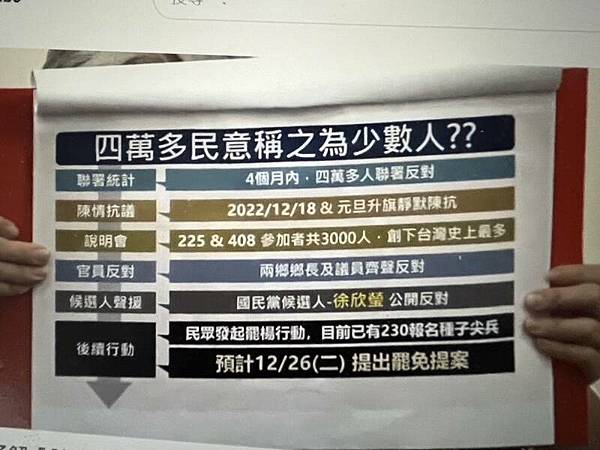 因此,自救會堅持反對,罷免連署行動如火如荼展開,已召集250名種子尖兵,不撤案就罷免。
