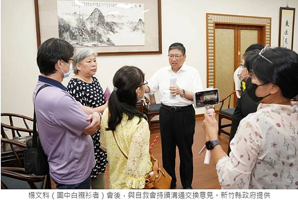 楊文科(圖中白襯衫者)會後,與自救會持續溝通交換意見。新竹縣政府提供