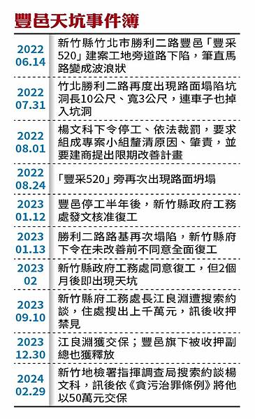 --113年7月17日,豐邑機構涉偷工減料釀天坑危及民眾安全,新竹縣長楊文科與前新竹縣政府工務處長江良淵涉圖利護航建商,皆依貪污罪嫌起訴。