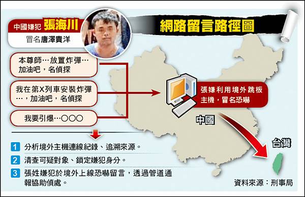 〔記者邱俊福/台北報導〕來台讀書的中國籍學生張海川,憑藉本身資訊工程專長,一開始盜用他人的學生電子郵件,遂行恐嚇被逮後,轉而改以「Tor」洋蔥網路、境外多層次跳板方式,隱匿本身IP位置,透過網路四處恐嚇放置炸彈,還PO文嗆警根本找不到他,自稱為「名偵探」,經警方過濾慣犯及分析犯案手法、用語與習慣,仍順利鎖定犯嫌身分。