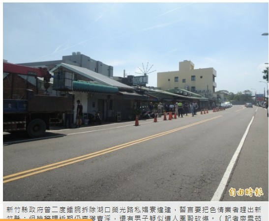 新竹縣政府曾二度鐵腕拆除湖口榮光路私娼寮違建,誓言要把色情業者趕出新竹縣;但檢警調近期仍查獲賣淫,還有男子疑似遭人圍毆砍傷。(記者廖雪茹攝)