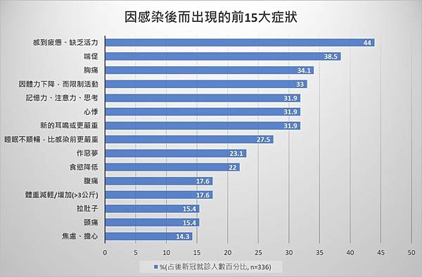 根據中國醫藥大學兒童醫院的「兒童後新冠特別門診」統計,兒童感染新冠後,最常出現的前 15 大長新冠後遺症依比例為: