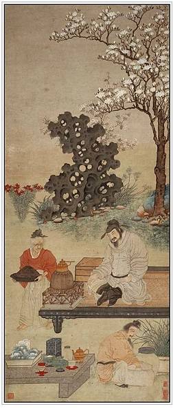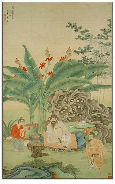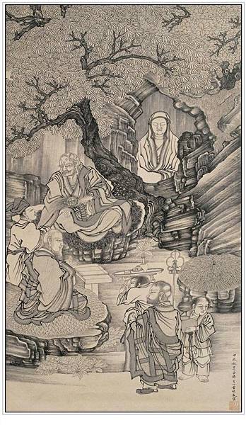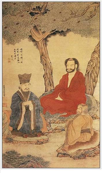 此圖畫孔子、老子、紅衣羅漢坐於樹下共同探究玄理的情景。畫中三位智慧長者面目嚴肅,神情專注,孔子儒雅敦厚,循循善誘,正發表言論;老子道貌岸然,謹慎而善辯,他注視著對方,似乎準備隨時發問;紅衣羅漢雙目低垂,安詳而平靜,從他緊鎖的眉頭可以看出他已沉於思索之中。
