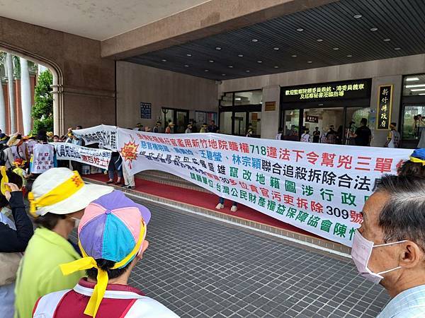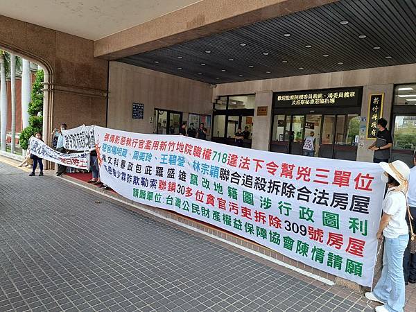 曾莉蓁率團在新竹地院執行處陳情請願,新竹地院執行處指派政風室代表出面接受陳情請願書,請求718執行官張倩影撤銷停止執行拆除她竹北市水防道路一段309號合法建築物。