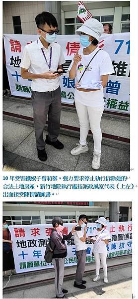 圖一:10年受害鐵娘子曾莉蓁,強力要求停止執行拆除她的合法土地房產,新竹地院執行處指派政風室代表(上左)出面接受陳情請願書。感動來自遙遠南方、歷經15年大戰台北士林地檢署檢察官林在培的劉素梅(下左)前來聲援。
