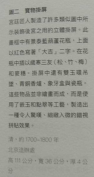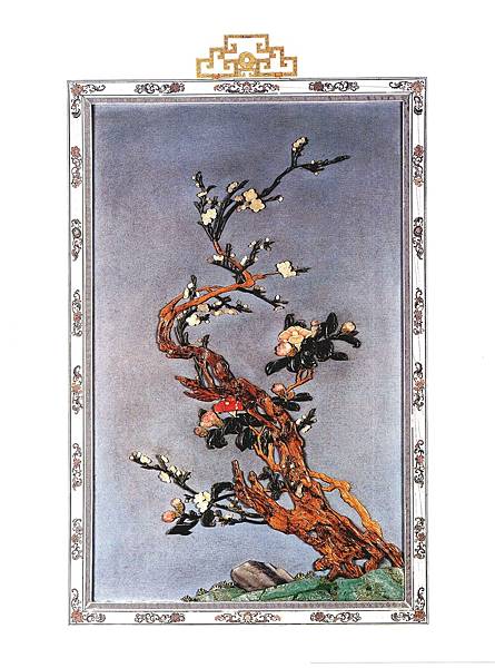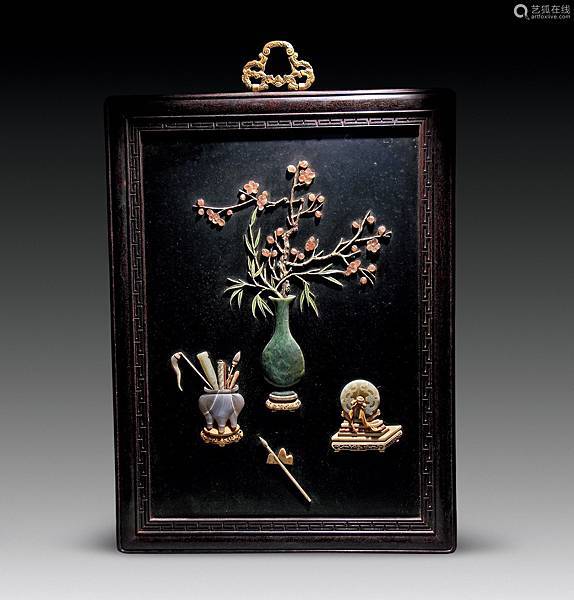 掛屏紫檀做框,內邊飾迴紋。中間打槽裝板,大漆地,主體鑲嵌各色玉片、珊瑚等材質呈現博古圖案。博古紋是古代裝飾中一種典型的紋樣,凡鼎、尊、彝、瓷瓶、玉件、書畫、盆景等被用作裝飾題材時,均稱博古,其中定有仿古紋飾玉片鑲嵌。在各種工藝品上常用這種題材作為裝飾,寓意高潔清雅。此件掛屏,梅花柳枝花插風格清雅,玉鼎筆劃充滿文人氣息,玉璧擺件富有玩味,三者合一,乃是文人自得其樂之趣。清代宮廷尤其喜愛使用掛屏裝飾,以達到富麗堂皇的裝飾效果,與其皇家身份相配。今故宮博物院重華宮等多處宮殿內均有此類陳設。
