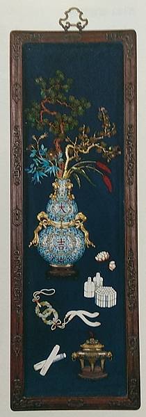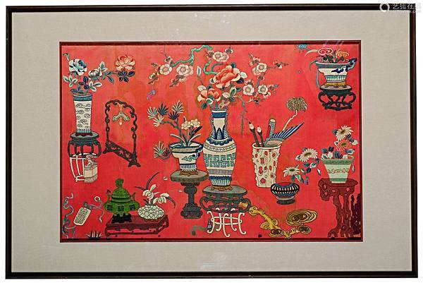 紅色緞為地,中間部分用五彩繡線為花几上擺設盆、瓶、碗盛以梅花、牡丹、玉蘭、菊花、蘭花等花卉的博古圖案,寓意“靈仙祝壽”,“富貴平安”等美好寓意。整個掛屏以螭耳花瓶為中心,紋樣佈局疏朗有致,繡工細膩精巧,寓意吉祥美好,整體給人以清新雅麗之感,文氣十足