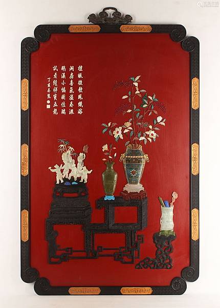 掛屏邊框紫檀木質,上雕纏枝蓮紋,屏面紅地,畫面中以紫檀木雕成茶几,鑲嵌有玉石嬰戲雕塑、琺瑯彩花瓶、玉製筆筒等古玩。屏面左上有乾隆嵌金楷書詩句