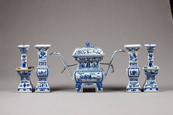 瓷質五供以乾隆朝燒造最盛,然而傳世所見多是散失不全,若能覓見一套的乾隆官窯五供絕非易事,更何況是道光者,故本品殊屬難得,為目前所知中外唯一完整的一套道光官窯五供。