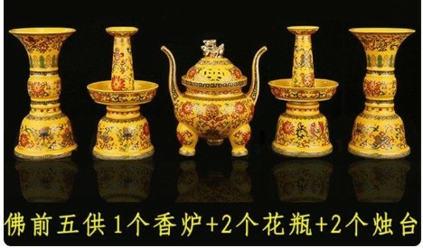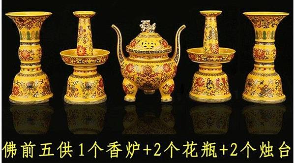 一尊香爐,一對燭台,一對花觚組成。這五件一套的供具合稱「佛前五供」。因為數量有五個也稱「五具足」或「五供一堂」。爐用來焚香,燭台用於燃燭,花瓶或花觚用來插花及吉祥供奉,其造型多仿制青銅器樣式流光溢彩,精美華麗。這五供本身就是一種殊勝的供養,其焚香、燃燭、插花的功能逐漸淡化。