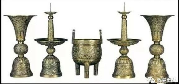 五供之事,佛道兩家乃至神位供奉皆有。具體到器物,常見為一爐、兩花瓶及兩燭台,或者一爐、兩花觚及兩燭台,其功用一致:爐用來焚香、燭台用於燃燭,花瓶或花觚用來插花及吉祥供奉。五供材質甚多,既有金、銀、銅、鐵、錫,又有琺瑯、陶瓷、玉石等。