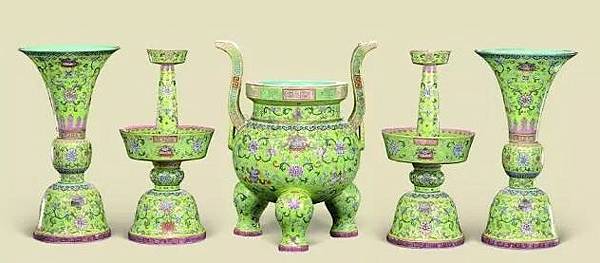 3021 清嘉慶綠地粉彩纏枝蓮托八吉祥紋(五供一套)