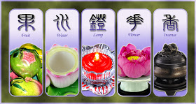 後來,供品演化為香、花、燈、水、果五種物品,是為“五供”:既表示對佛、菩薩的恭敬和禮拜,也像徵著“六度”。