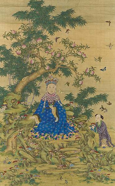 兩幅圖畫的構圖幾乎一模一樣。圖中的慈禧太后衣飾華貴,裝扮成觀世音菩薩的模樣,端坐在桃樹下,桃樹結滿果實,周身翠竹、靈芝、彩蝶環繞,一童子雙手捧靈芝在一旁跪拜,全圖為 「童子拜觀音」的內容。圖畫中充滿了祈福的元素,應當是為「老佛爺」祝賀生日而畫的。