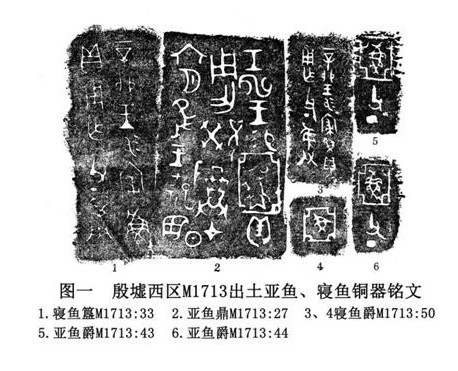 河南安陽殷墟西區M1713隨葬有亞魚鼎(M1713:27)、寢魚簋(M1713:33)、寢魚爵(M1713:50)、亞魚爵(M1713:43、44)等[1]。五件銅器均有較長銘文,且共存在同一座墓葬中,具有重要研究價值,可以啟發我們對相關問題的進一步思考。為討論方便,將銘文引述於下(圖一):