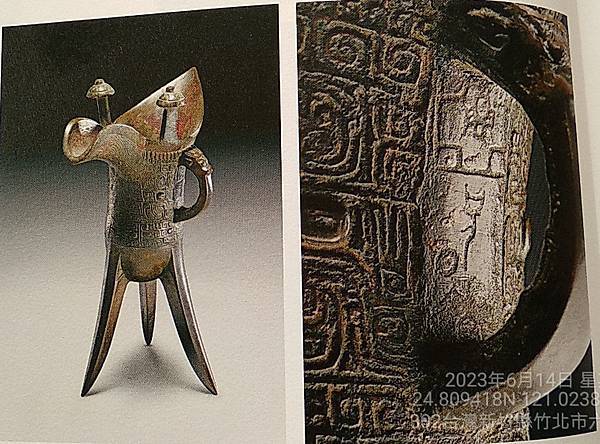 告亞正爵(08788):“告亞正。” [12]商代晚期。出土於河南安陽。現藏北京故宮博物院。長流槽,尖尾上翹,流折處有一對傘狀柱,腹內側有獸首鋬,卵形突底,三條三棱錐足外撇。腹飾連珠紋鑲邊的夔紋帶。