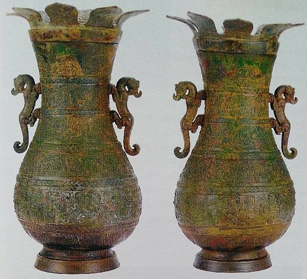 冊告卣(04872):“冊告。”商代晚期。現藏美國賽克勒美術館。侈口細長頸,下腹外鼓,圈足,頸的下部兩側有鈕,套接龍頭Ω形提梁,蓋面隆起,上有一個菌狀鈕,提梁內側有環,以鏈條套接蓋鈕。頸飾獸面紋和鳥紋,圈足飾雲雷紋,腹飾鴞紋,鴞的雙目圓睜,毛角高聳,鴞足伸入圈足的雲雷紋中。通高29.9、口徑9.5厘米。