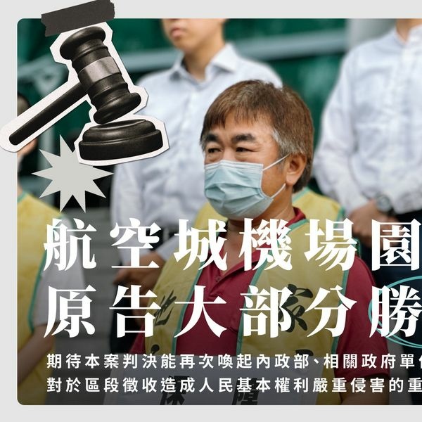 航空城機場園區土地徵收撤銷訴訟,在居民及律師團的堅持下,有幸獲得臺北高等行政法院的勝訴判決!感謝臺北高等行政法院法官仔細審視本案處分之瑕疵,期待本案判決能再次喚起內政部、相關政府單位及台灣社會對於區段徵收造成人民基本權利嚴重侵害的重視。另呼籲內政部及交通部民航局與其耗費資源上訴,不如偕同桃園市政府等相關單位,立即檢討整體航空城計畫並與原告協商保留方案,勿使號稱為「國家重大建設」的航空城蒙上侵害人權的陰影。
