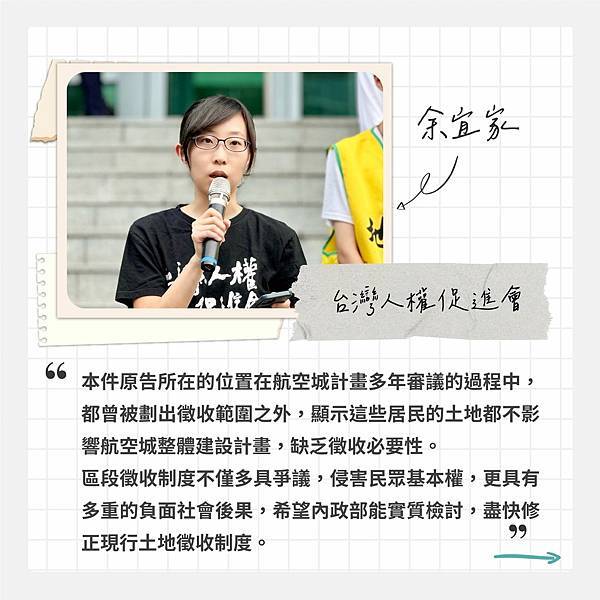 台灣人權促進會秘書長余宜家表示,「呼籲民航局趕快跟居民討論,也呼籲內政部不要再上訴,航空城計畫多年的審議期間,其實都曾經被劃出徵收範圍之外,或者是他們鄰近的土地,就是幾乎相同的區位,卻不需要被徵收,也顯示了這些居民的土地,它其實並不妨礙航空城的整體建設計畫。」
