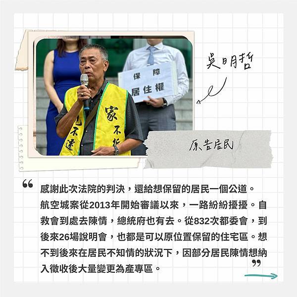 居民代表吳明哲說:「當時總統要你們回答,你們沒有一個人敢回答,現在既然判決了,你們不要再有動作了,趕快把這個航空城案定下來,好好的來建設。」