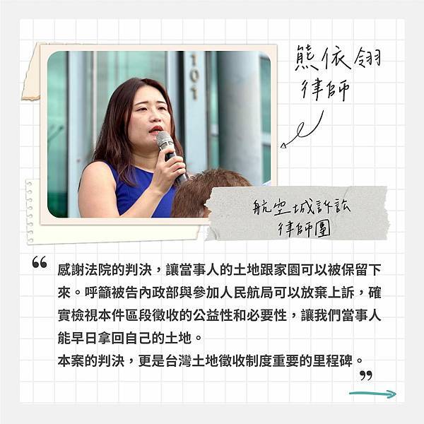航空城訴訟律師團律師熊依翎表示,「雖然我們目前還沒有看到,法院就本件有關區段徵收違法性的相關判決理由,但是我們相信這個判決,也給予所有在辦理的徵收案件機關,一個很重要的警示,所有的徵收都必須符合公益性、必要性跟比例原則。」