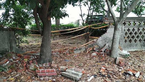 1.將所有震後古厝材料、磚瓦、殘片等廢棄物深埋於後埕正身後方,形成一小土堆,除了增加“後高前低”的格局外,將來也可取出做研究用。