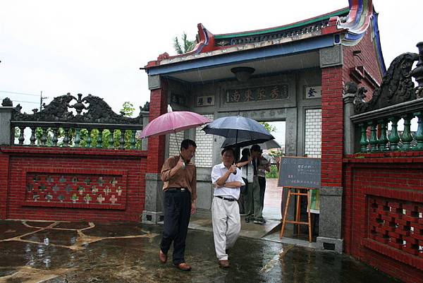 台14線芬草路的道路高於敷榮堂約一公尺,無法排水。原設計由入水口引水注入月眉池,溢出後,由水管引導環繞整個園區再繞回原入水口,也就是現在水閘門入水口,位於草商後門,等於繞了360度,距離超過150公尺,工程浩大,而且水位高低僅差46公分,水流慢,又容易積土,更不要說經費有多高,陳木勇與我多次勘查芬草路旁大排水溝,利用虹吸原理,在溝旁打一洞,園區積水自然排除,萬一排不完,應該也不會積水很多,必要時可在牆角做一陰井,利用抽水機抽水可省不少工程費。二年間,經過五次颱風,園內不見大積水,更增加我的信心,洪文雄教授說排水是最後工程先知道就好,也許最多採陰井加自動抽水馬達就解決了。誰知,洪教授不幸離開人世,真是惋惜,看來要依賴自己的判斷了。2004年的七二水災,中部受災嚴重,敷榮堂沒淹到主體,因此,我向委員會說明原委,省下一筆不小的建設費。如今過了三年,歷經多次豪雨,安然無恙。同時也佩服阿公當初建敷榮堂時,的確也經一番仔細勘察、設計過,否則怎能避開歷史上的八七、八一、賀伯還有七二水災的肆虐呢?