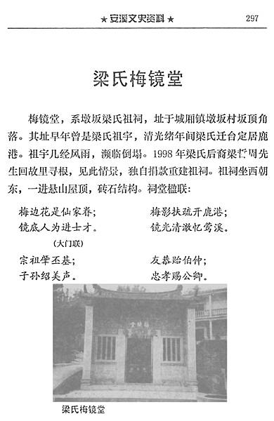 梅鏡堂:台灣省的梁姓,不論是河洛,還是客家,絕大多數都屬於「梅鏡堂」,是宋朝名相梁克家的後裔,詳情已如上述。梁客家是距今八百年以前的福建晉江人,很顯然,今天台灣島上的梁姓省籍人士,不管「唐山」的祖籍是福建或廣東,他們的根源,都可以初步追溯到福建省的晉江。