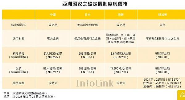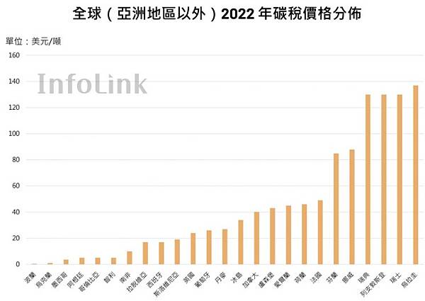 環保署之研擬,初始價格非常有可能訂為每公噸新台幣 300 元(約為 10 美元)或更高-新加坡甚至會高達每噸 500 元-周遭國家的初始價格都不高,大約落在每噸 100 至 200 元而已-台灣與其他鄰近亞洲國家的碳稅稅率(或碳費)屬於全球後段班,平均每噸僅約 10 美元,然而許多國家的稅率已高達每噸 100 美元以上。不僅如此,此稅率還有持續上升的趨勢,例如瑞士的稅率便從 2021 年的每噸 101 美元上升至 2022 年的每噸 130 美元 https://bit.ly/3PmE2aW