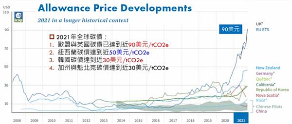 碳定價標準不一,僅3.76%碳價符合巴黎協定預期2020年每噸40-80美元的定價水準,其中符合價格水準的交易所僅歐洲與瑞士。而至2030年,則須將碳價格提升至每噸100美元,才能達到全球升溫控制2°C內的目標-2024年上路,首波將被徵收碳費的企業,是年排放量高於2.5萬公噸,共287家的碳排大戶。歐盟在2021年開始限制汽車業「每公里排碳 95 克」,而實際上2019年全歐盟車輛的平均碳排放量是每公里 122.4 克