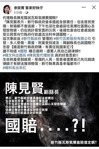 余筱菁 客家好妹仔 - 2021年竹北氣爆即有警訊,新竹縣府坐視不理,草菅新竹縣民! #預防不力 #救災無力… | Facebook