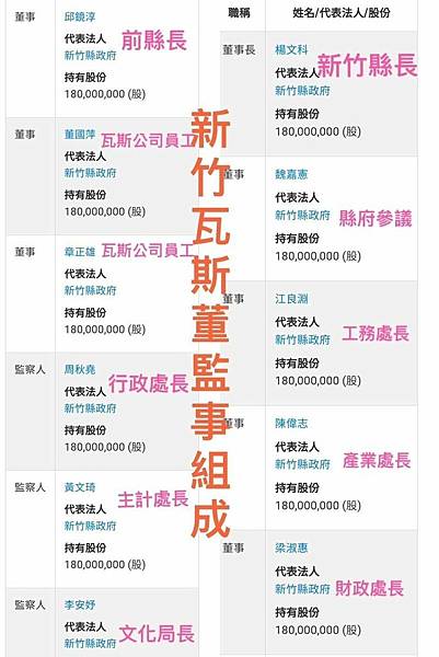 ,新竹瓦斯董監事由縣府官員充任,設置一名退休官員為總經理。新竹瓦斯經營上對縣府負責,行政上公司法對經濟部負責,但不受議會監督! 儼然成為縣府小金庫,充斥私有人事安排!